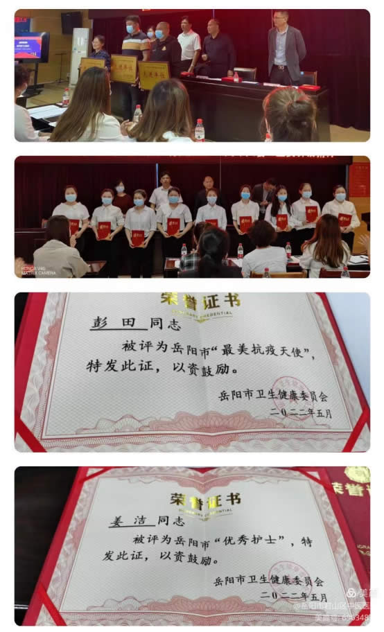 我院荣获卫健系统"综合治理奖"!恭喜我院彭田获得岳阳市最美抗疫天使、姜洁获得岳阳市优秀护理工作者、陈佳,王耀若,曾佳慧,冯丽群获得区级优秀护士、李丽、戴晨、曹蕾、王小娣获得君山区中医医院优秀护士荣誉!